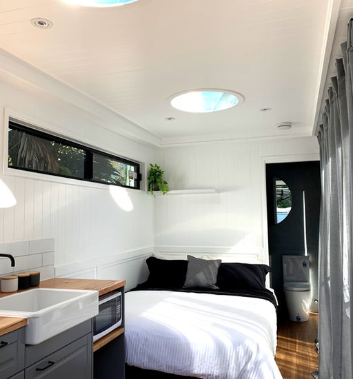 With a reconfiguration of the layout and added features, this version of the Hamptons Style container is more accommodating to a longer stay. Added features include an LCD tv, large kitchenette, bathroom vanity unit with storage as well as the circular mirror create a standout bathroom. Fully-screened opening of the cargo doors end allows an abundance of flow-through breeze and natural light to flood this stunning container.